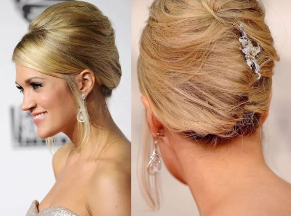 Начес. Для создания этого варианта прически отделяют верхнюю часть волос, которой придают объем с помощью начеса. Пряди фиксируют на затылке с помощью крабика.