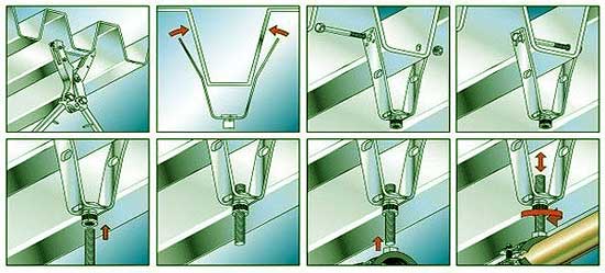 Любопытно, что v образное крепление к профнастилу состоит в удобстве монтажа: его можно очень легко настроить под разные формы профилей – необходимо только заблаговременно выделить точки сгибов. Потом держатели крепят на штифты в собственно приготовленные для них резьбовые отверстия – вместе с профлистами.