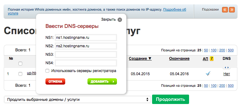 После этого необходимо нажать кнопку «Добавить». Обновление DNS-серверов может занимать до 48 часов.