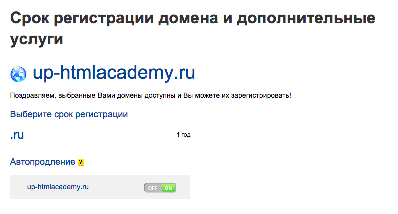 Здесь можно сразу включить автопродление своего домена по истечении срока его действия. Помимо этого можно выбрать другие услуги. После чего нажимаем кнопку «Далее».