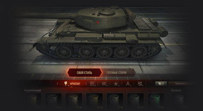Для каждой нации техники доступен ряд декоративных красок, которые можно наносить на отдельные части машин: корпус, ходовую, башню, маску орудия и само орудие. Для покраски одной детали машины требуется одно ведро краски. Соответственно, чтобы выкрасить целую машину для одного типа карт, вам понадобится максимум пять вёдер.
