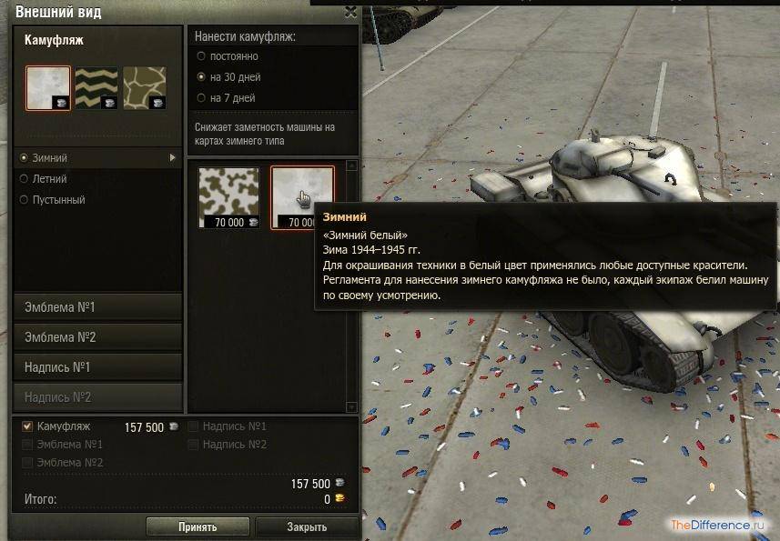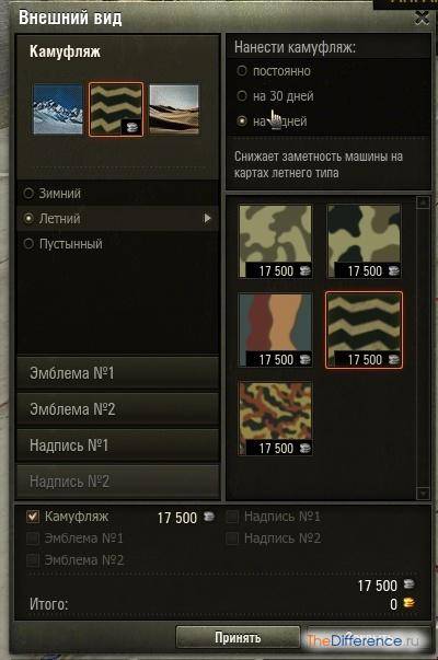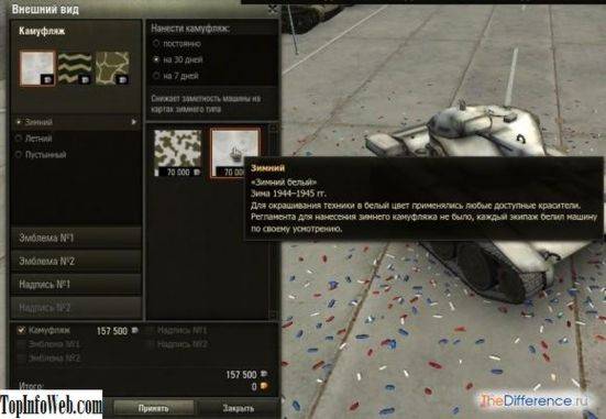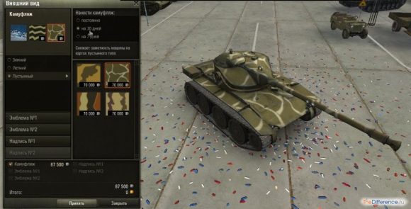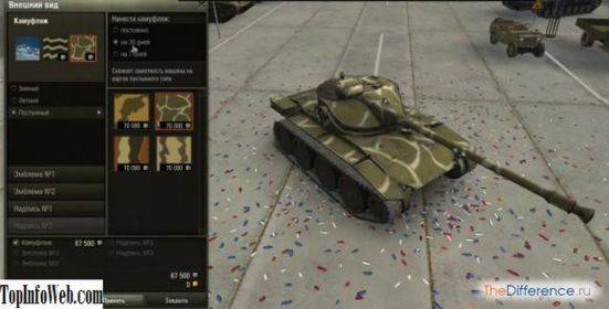 Если на балансе не хватит средств, то сумма за камуфляж выделится красным цветом. Wargaming нередко проводит акции, в которых игрокам предлагается приобрести камуфляжи по сниженной на 50 процентов цене. Если вы решили «покрасить» все танки, то рекомендуется дождаться подобной акции, ибо это поможет сэкономить голду и серебро.