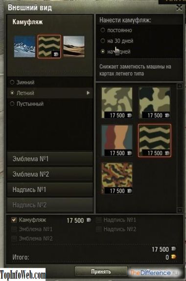 Одновременно вы можете купить 3 окраски на разные периоды. Общая сумма за камуфляж отображается внизу. Чтобы окончательно приобрести камуфляжи, нужно кликнуть кнопку «Принять».