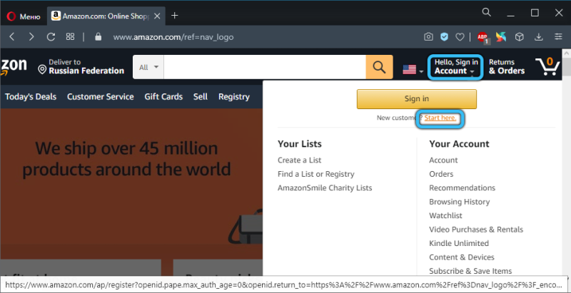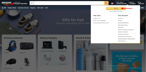 Перед регистрацией убедитесь, что доставка у Вас стоит в Российскую Федерацию. Далее, переведите курсор мыши на верхний раздел «Account & Lists» и нажмите на оранжевую кнопку «Sign in».