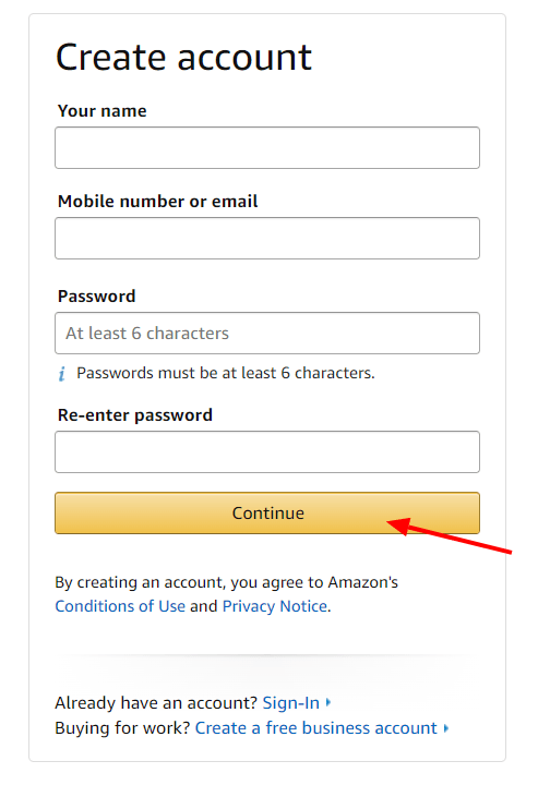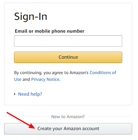 Всё начинается с регистрации на главной странице сайта. Поскольку пользователь новый, ему нужно создать собственный Amazon-аккаунт. Для этого предусмотрена соответствующая кнопка «Create your Amazon account».