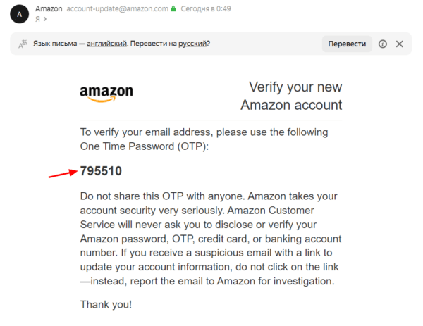Для регистрации я выбрала привязку электронной почты, потому код для регистрации мне должен прийти в автоматической рассылке от Amazon на почту спустя пару минут. Письмо с кодом должно выглядеть так: