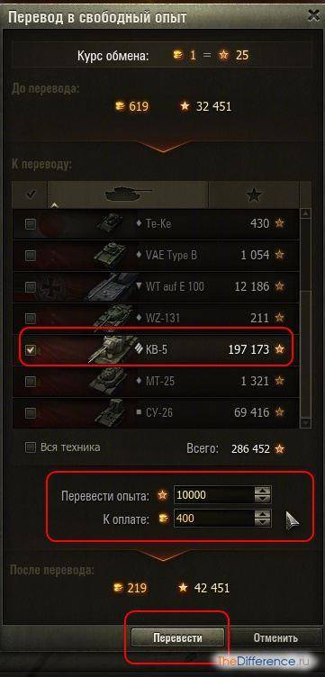 Если вам нужно перевести опыт с определенной боевой машины, то снимаем галочки с других танков, вводим сумму нужного вам свободного опыта и кликаем «Перевести». Курс обмена опыта составляет 25 единиц опыта к 1 единице золота.