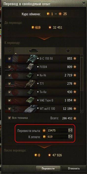 Кнопка для переноса находится в главном меню, на ней изображено количество заработанных на данный момент очков. После ее активации появляется специальное окошко с подробным списком всех элитных танков. Перед тем как перевести опыт в World of Tanks, необходимо отметить галочкой все необходимые единицы техники.