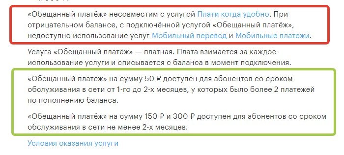 - Услуга несовместима с функцией «Обещанный платеж».