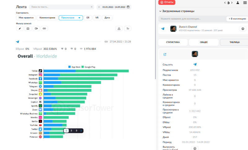 Popsters позволяет просматривать статистику любого канала в Telegram за выбранный период, сортировать посты по нужным показателям и смотреть насколько количество подписчиков совпадает с реальной картиной. Для удобства в Popsters можно загружать статистику сразу нескольких каналов и сравнивать их, не выписывая отдельные цифры.