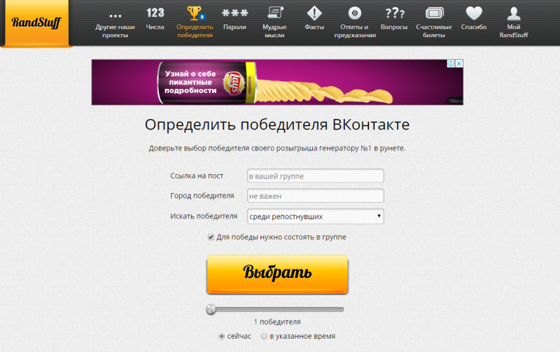 Достаточно вставить ссылку на пост и выбрать условия отбора (из лайков или репостов) и сервис покажет вам случайно выбранного человека. Не забудьте снять это на видео или сделать прямой эфир.