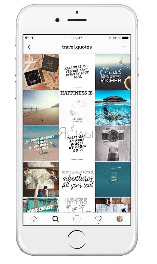 Аккаунт travel.quotes наполнен таким образом, что цитаты на белом фоне всегда расположены по середине.