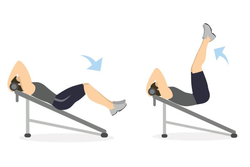 Облегченная версия подъемов ног в висе — подходит новичкам. За счет мышц пресса необходимо поднять ноги вверх, слегка оторвав поясницу от скамьи.