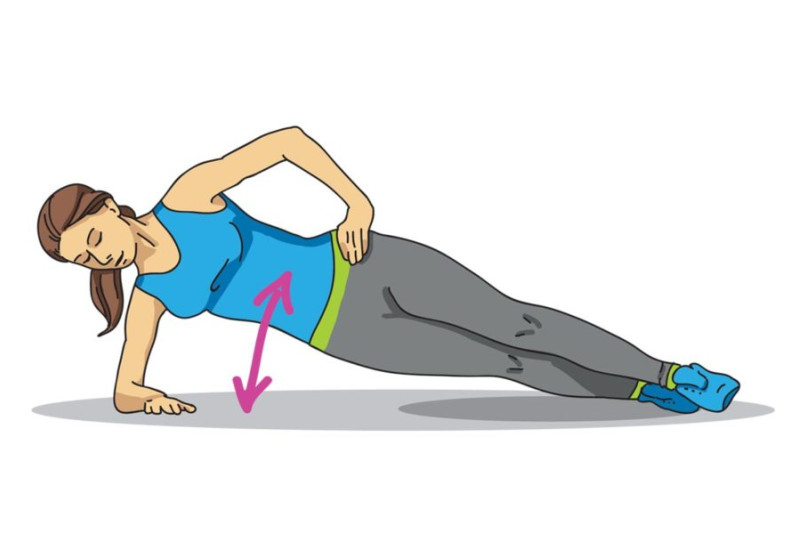 Первое упражнение программы на разминку. Займите положение боковой планки на локте. Медленно опустите таз и бедра вниз, после чего вернитесь в исходное положение. Положите руку на пояс, чтобы лучше чувствовать работу бокового пресса. 2-3 подхода по 10 повторений на каждую сторону