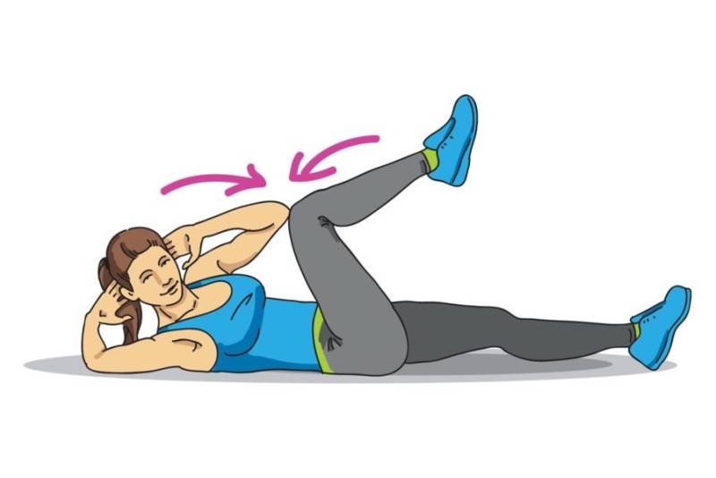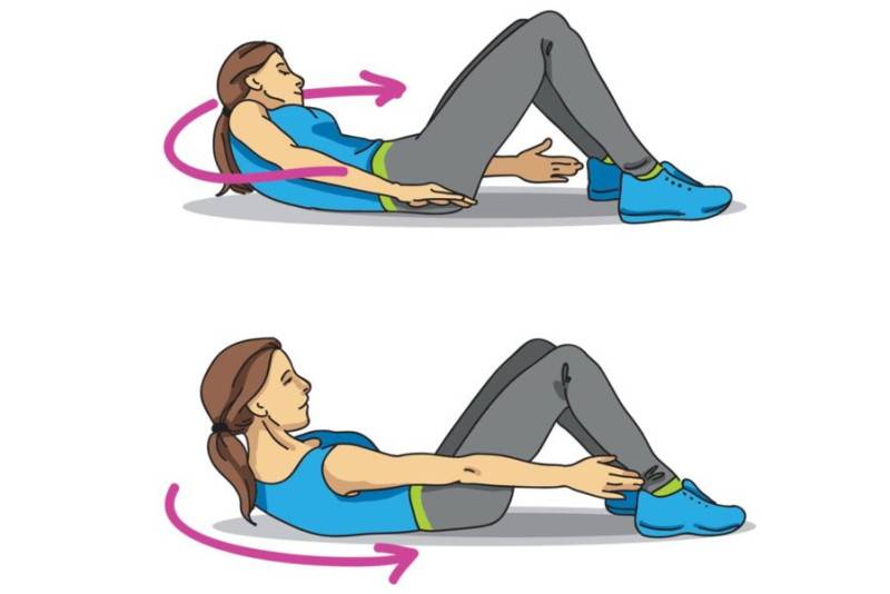Лежа на спине, за счет вовлечения мышц прямого пресса приподнимите верхнюю часть туловища, после чего совершайте поочередные “наклоны”, тянясь рукой к голени. Следите за тем, чтобы шея не была в чрезмерном напряжении и не отрывайте поясницу от пола. 2-3 подхода по 10-12 повторений на каждую сторону