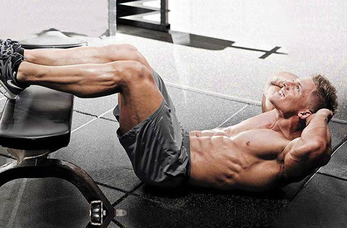Ложитесь на пол и положите голени на скамью, согнув колени. Затем просто отрывайте плечи от пола. Не надо пытаться подать туловище как можно выше, иначе заработают сгибатели бедра. «Скручивания» – это движение с подчеркнуто небольшим диапазоном. Нижняя часть позвоночника ни при каких условиях не должна отрываться от пола. Даже не пробуйте касаться коленей локтями! Скручивайте именно пресс, а не позвоночник. Выполните 4 подхода по 15-25 скручиваний (при необходимости используйте дополнительное отягощение). Отдых между подходами 30-60 секунд.