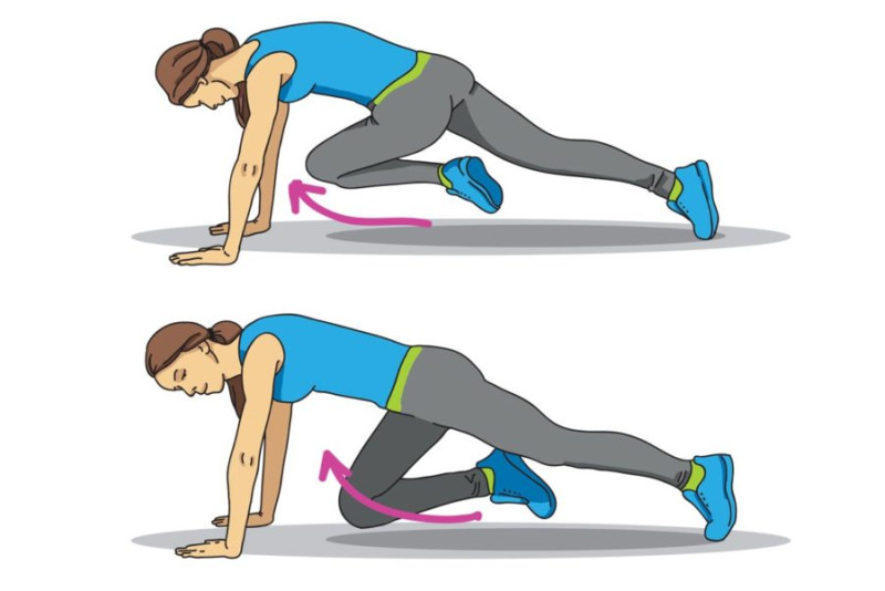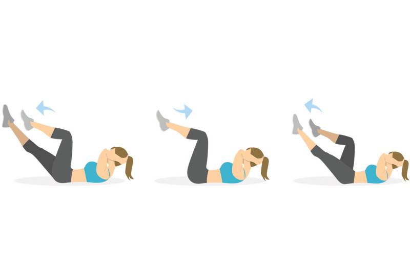 Совмещает классические скручивания с поочередным подтягиванием ног по направлению к груди. Развивает косые и поперечные мышцы живота.