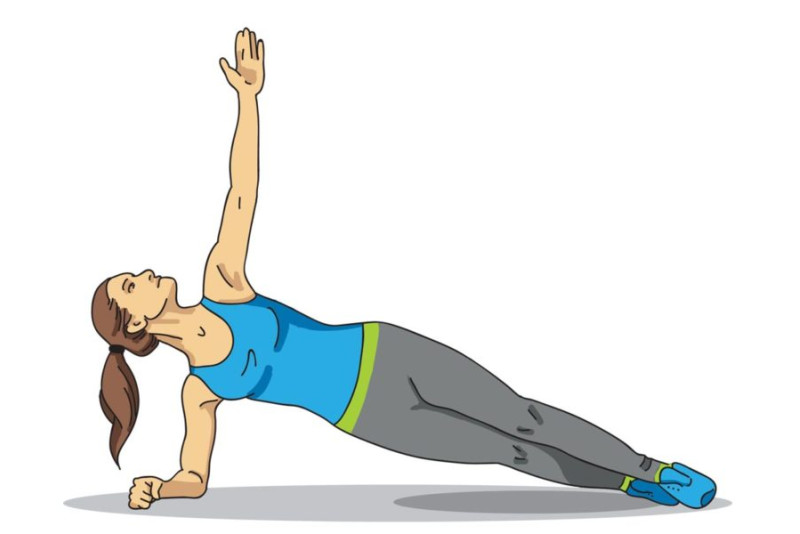 Займите положение боковой планки, одна рука служит опорой, вторая — поднята вверх. Следите за тем, чтобы тело сохраняло прямую линию, а таз не заваливался назад или вперед. Также следите, чтобы шея не была напряжена (взгляд перед собой или вверх). 2 подхода по 30-50 секунд на каждую сторону