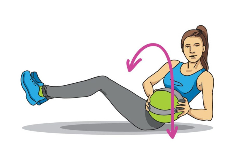 Сидя на полу, поднимите согнутые в коленях ноги до параллели. Возьмите в руки мяч и начните совершать поочередные повороты в стороны, в финальной точке касаясь мячом пола. Во время движения старайтесь как можно сильнее напрячь абдоминальные мышцы. 3-4 подхода по 15-20 повторений