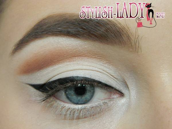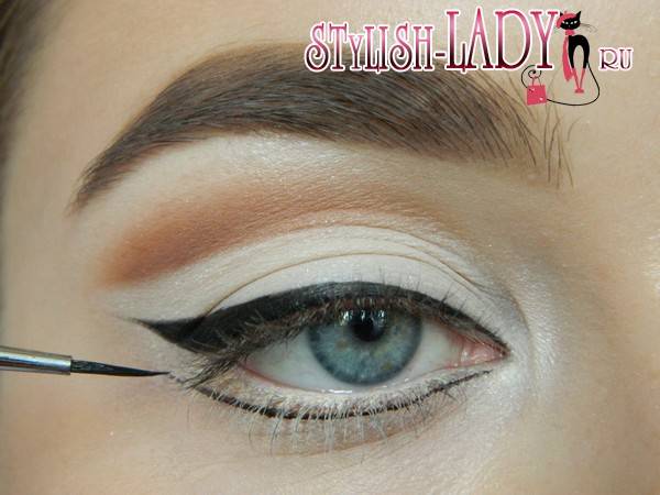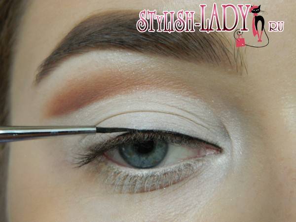 - рисуется линия вдоль роста ресниц чуть шире, чем обычно. Стрелку, расположенную у внешнего уголка глаза, следует расширить и приподнять;