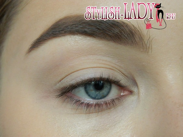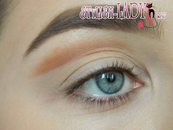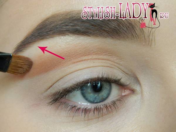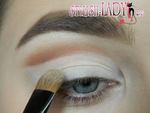 Теперь заполним подвижное веко светлым оттенком теней. Для этого лучше взять широкую плоскую кисть и вбивать тени прихлопывающими движениями. Наносим тени впритык к линии коричневой детали. Этими же тенями подводим зону под бровью.