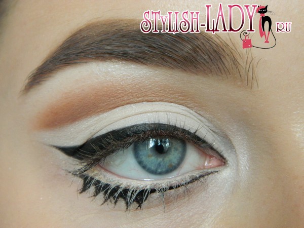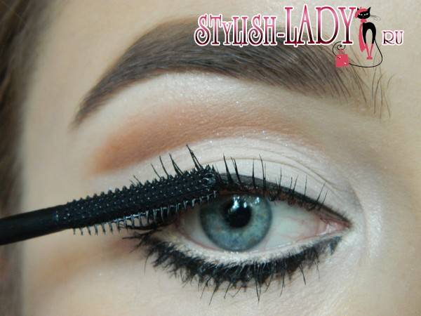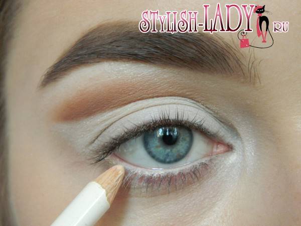 Высветлим кайялом слизистую глаза, прокрашивая очень хорошо ресничный ряд и под ним ещё несколько миллиметров вниз. Только не берите белый карандаш для этой цели, так как он только подчеркнёт какие-либо недостатки, если у вас есть воспаления, покраснения на глазах. Молочный оттенок сделает макияж более натуральным.