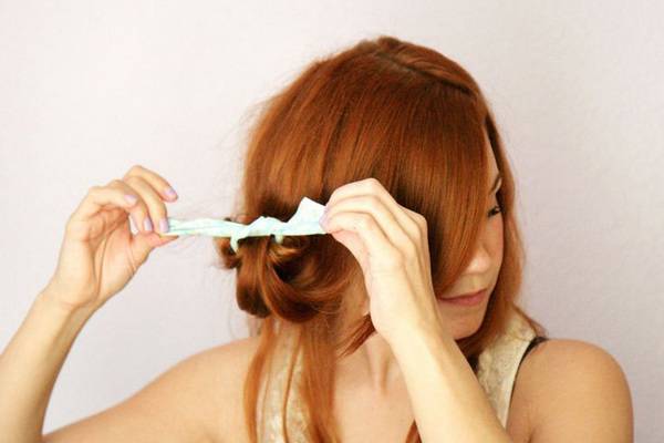 - Накрутить. Для этого зажать концы волос тряпочкой и наматывать, продвигаясь к корням. Накрученные пряди затянуть ниткой или между краями ленты, в зависимости какую конструкцию лоскутов вы используете.