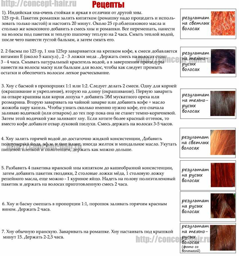 Для проявления разных рыжих оттенков берут 2 части хны и 1 часть басмы. Меняя продолжительность выдержки краски на волосах, получают следующий результат: 30 минут – лёгкая рыжинка, 1 час – огненно-рыжий, 4 часа – тёмно-рыжий.
