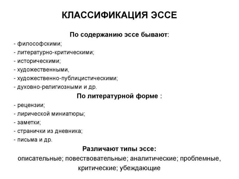 Также эссе по содержанию можно поделить на несколько подкатегорий:
