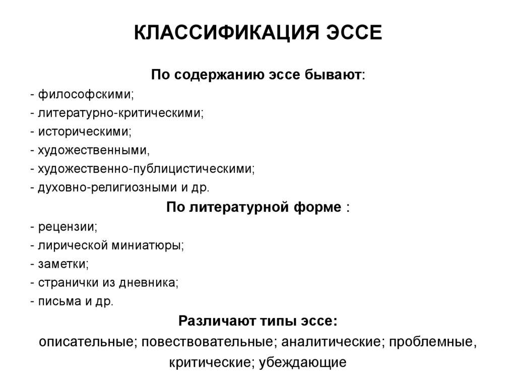 Также эссе по содержанию можно поделить на несколько подкатегорий: