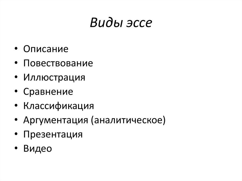 Существует несколько общепринятых видов эссе, о некоторых из них расскажем ниже.
