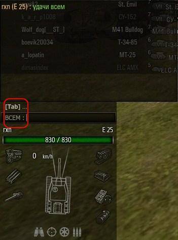Боевой чат — aктивация боевого чата. Теперь вы можете написать сообщение. Нажмите Enter ещё раз, чтобы отправить сообщение в чат всей команде. Если вы играете взводом и хотите обмениваться сообщениями только с игроками в вашем формировании, переключитесь на взводный боевой чат.