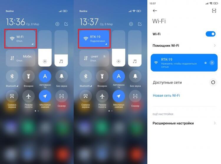 Смартфон сразу запомнит сеть и будет автоматически подключаться к ней при нахождении в радиусе действия роутера. А вы сможете включать и выключать вайфай без посещения настроек через шторку уведомлений (центр управления). Сделайте свайп от верхней части экрана вниз и нажмите на значок «Wi-Fi». Если задержать палец на нем, вы попадете в настройки подключения.
