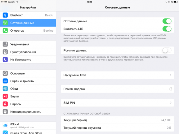 Настройка планшета в системе iOS происходит аналогичным образом. Нужно войти в раздел настроек, после чего выбрать в меню строку «Сотовые данные». В открывшемся окне поставить в положение «Включён» тумблеры напротив строк «Сотовые данные» и «Включить LTE». Затем щёлкнуть по строке «Настройка APN» и ввести в соответствующие поля значения, полученные у сотового оператора. Для проверки доступности интернета запустить установленный на устройстве браузер.