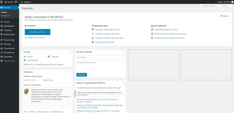 На скриншоте ниже отображена администативная панель (админка) WordPress: