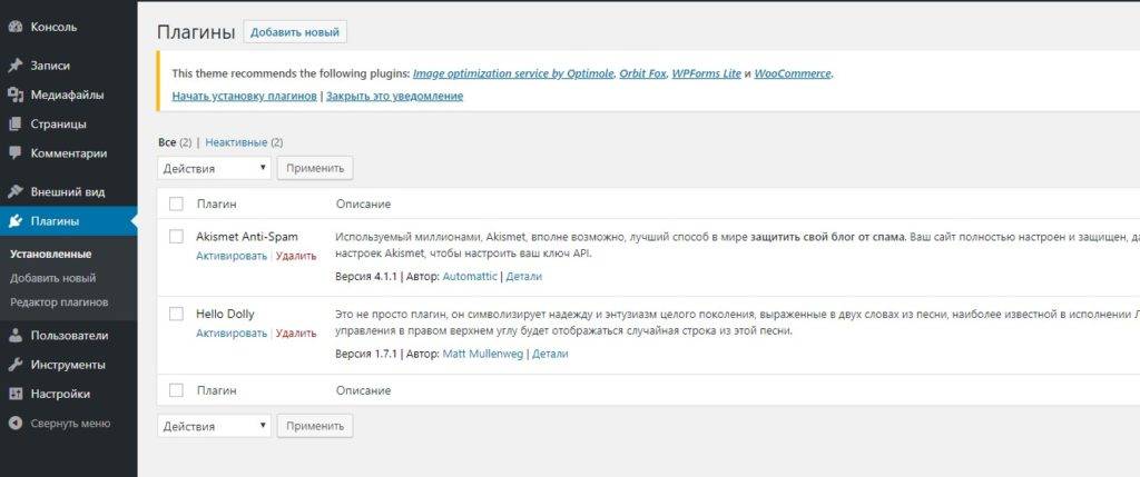 В редакторе WordPress доступен ряд функциональных плагинов, необходимых для построения и оптимизации сайта. Два устанавливаются по умолчанию. Причем Hello Dolly можно отключить – он не несет никакой пользы:
