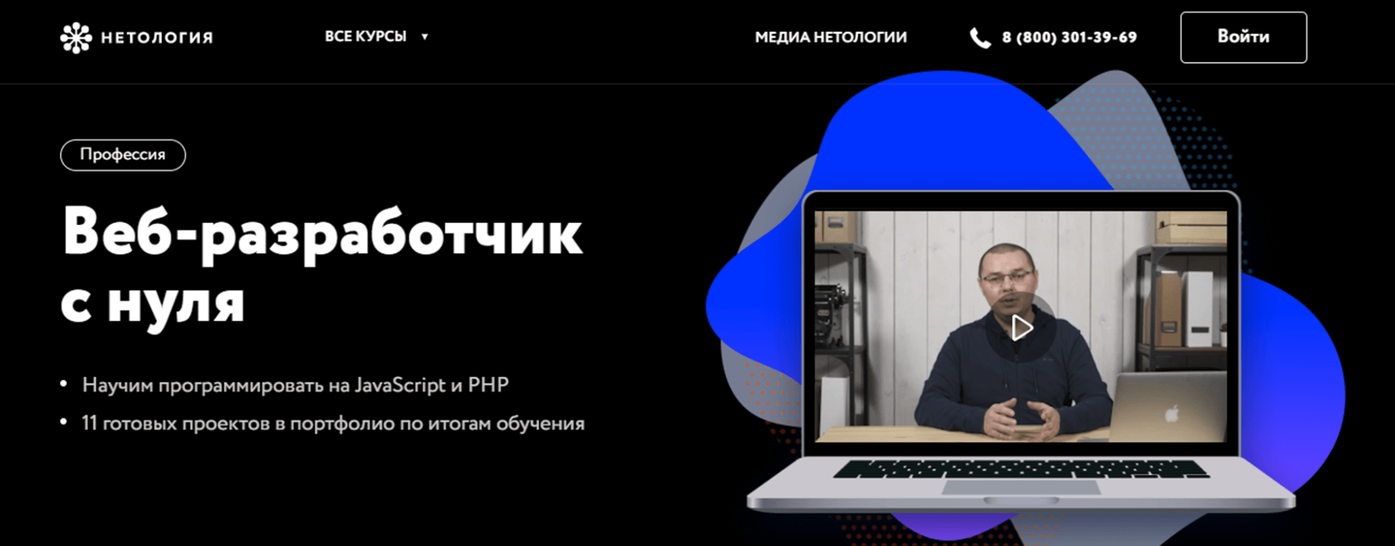 Описание: Нетология – центр образования, где вы научитесь программированию на JavaScript и PHP. По итогам обучения ваше портфолио на 11 качественных проектов. После обучения вы сможете стать фронтенд-разработчиком, работать с бэкендом веб-сервисов, что станет несомненным плюсом на фоне других начинающих разработчиков.