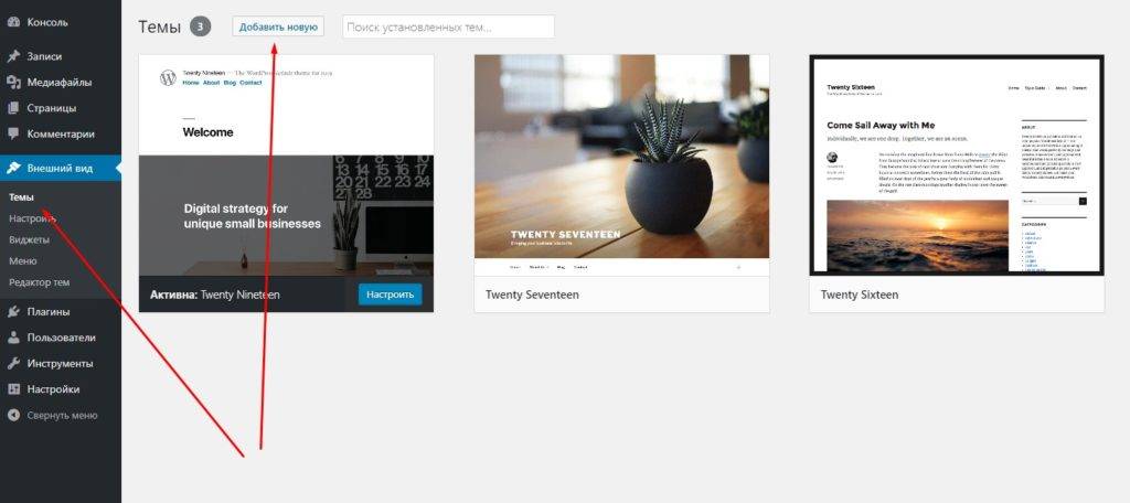 Перейдя на вкладку «Внешний вид» — «Темы», выберите оптимальный шаблон сайта. Чтобы открыть каталог всех доступных тем, нужно кликнуть на «Добавить новую»: