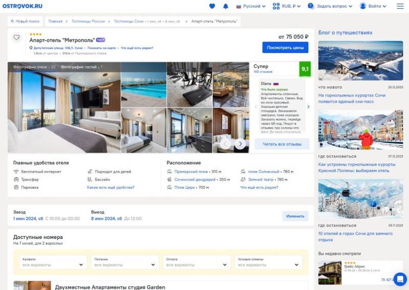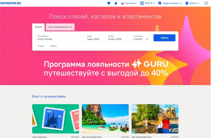 Сайт очень сильно напоминает одновременно и Booking, и TripAdvisor, разобраться в нём несложно. Это старый проект, который получил сильный «буст» с уходом международных компаний из России. Некоторые вещи смотрятся устаревшими, но в целом всё работает нормально – кроме того, что при первом открытии надо подождать секунд 20, прежде чем подгрузятся фирменные шрифты.