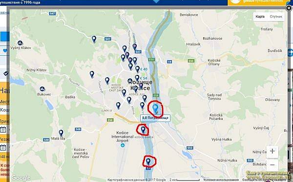 После чего открывается карта Кошице с нанесенными на ней отелями, и я начинаю присматривать потенциальные варианты размещения прямо на карте, исходя (как и было сказано выше) из одного критерия — близости объекта к основному маршруту: