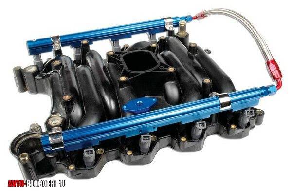 - Топливная рампа. К ней походят трубка или шланги от магистрали, а также зачастую вкручиваются сами инжектора.