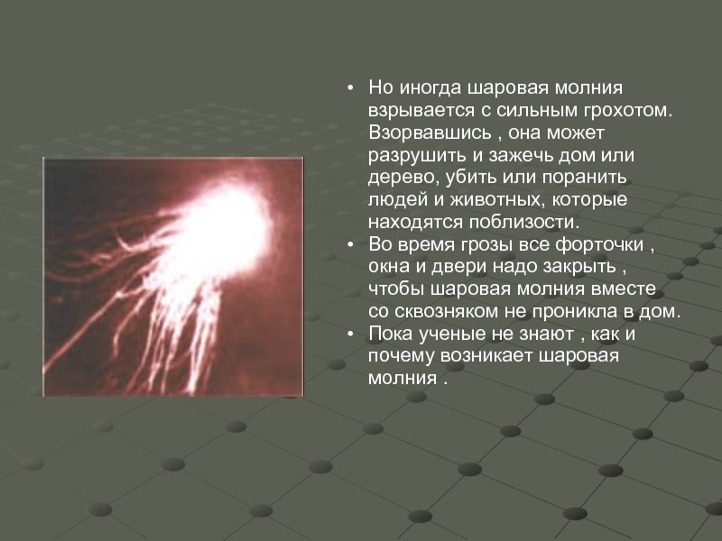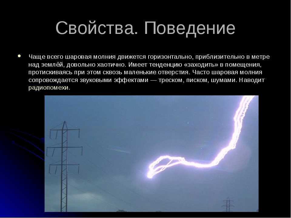 Встреча с таким электрическим шаром не сулит ничего хорошего. И если удар молнии с неба можно предотвратить с помощью молниеотвода, то от шаровой молнии нет спасения. Она может проходить через твердые тела — стены, камни, а при полете издает странные звуки — жужжание, шипение. Ее действия нельзя предвидеть, от нее невозможно убежать, а иногда она ведет себя настолько странно, что некоторые ученые считают ее разумным существом.