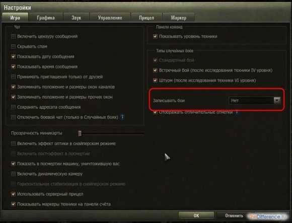 Если у вас включена запись боев, то со временем объем папки с реплеями будет лишь расти. К примеру, файлы с записью тысячи боев занимают около 800 мегабайт. Вам не нужны реплеи? Запустите игру и зайдите в «Настройки». Во вкладке «Игра» отключите запись боев, выбрав из выпадающего списка пункт «Нет».