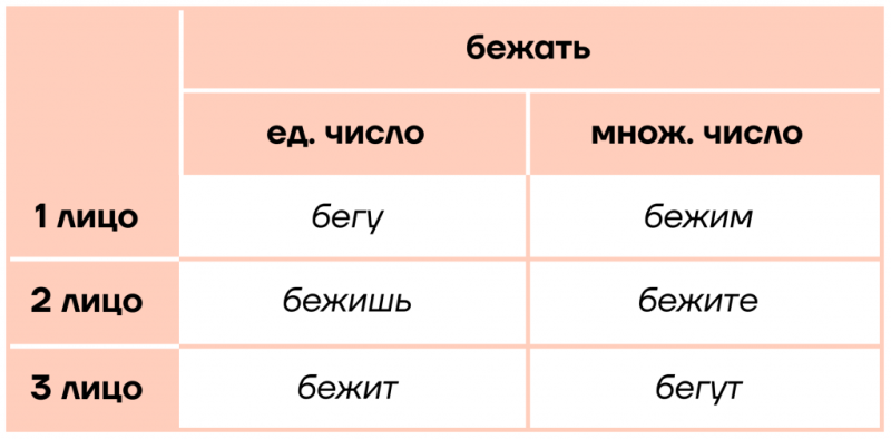 А здесь у нас только формы «бегу» и «бегут» похожи на первое спряжение, остальные — явные представители второго.