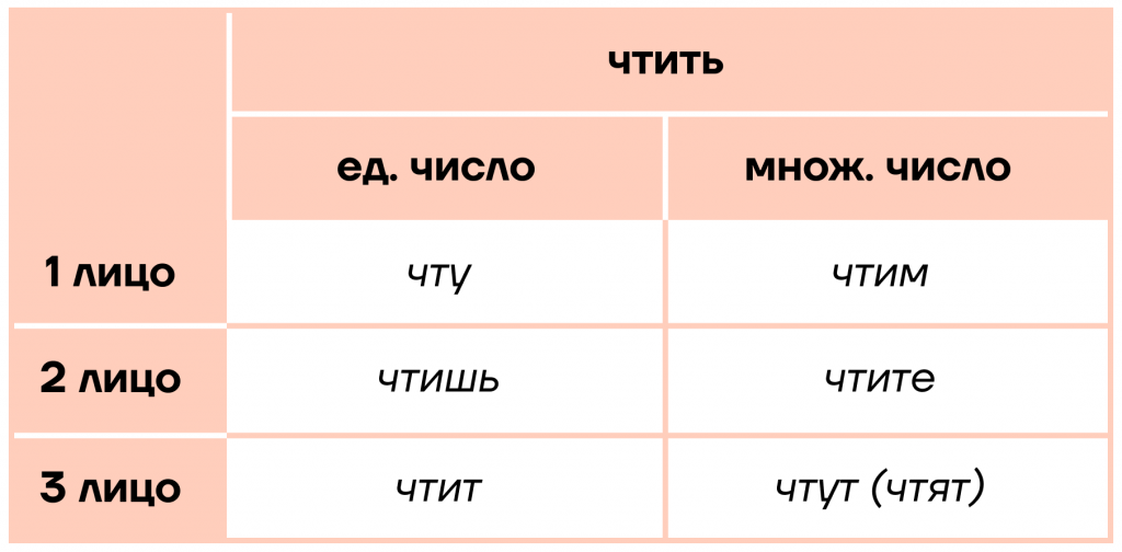 При склонении слов ЧТИТЬ, БЕЖАТЬ так же, как и в слове ХОТЕТЬ, в единственном числе будет окончание 1 спряжения, а во множественном — второго.