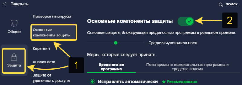 - Зайдите на вкладку «Защита», затем «Основные компоненты».