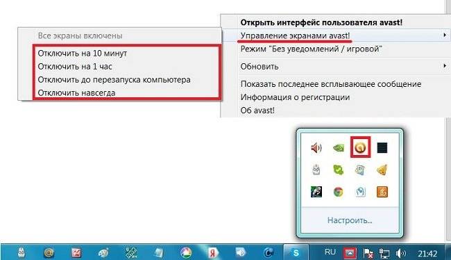 Перед тем как временно отключить антивирус, необходимо убедиться, что у него имеется такая функция. Например у Avast она присутствует. Для этого в трее находим значок вашего антивируса и после нажатия правой кнопкой мышки, выбираем «Управление экранами антивируса» и отмечаем необходимый промежуток времени.
