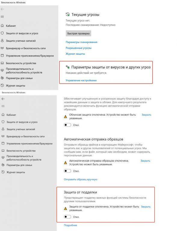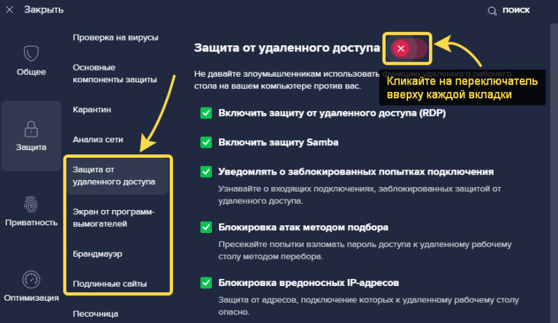 4 из них отображается в том же разделе «Защита». По очереди открывайте подразделы «Защита от удаленного доступа»; «Экран от программ-вымогателей»; «Брандмауэр»; «Подлинные сайты» и ставьте переключатель в положение «Выкл.».