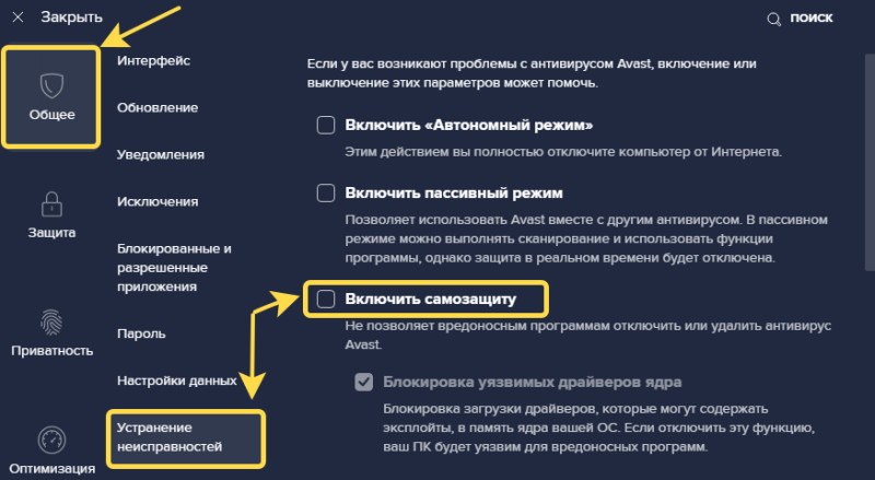 - В разделе «Общее» перейдите на вкладку «Устранение неисправностей» и снимите галочку в опции «Включить самозащиту».