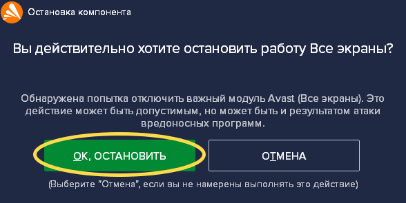 Предупреждение при попытке выключить Avast